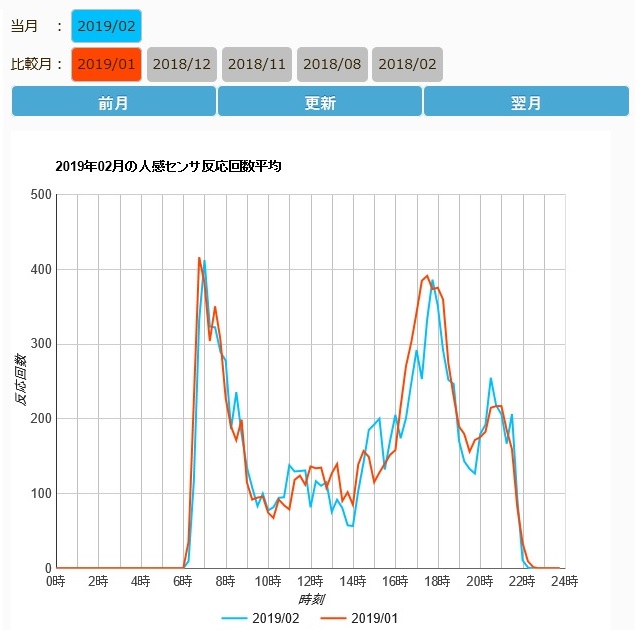 人感センサの反応回数は生活スタイルを反映しています。 部屋に閉じこもっていると反応回数は大きくなり、アクティブに活動している場合は、変動量が大きくなります。 一日の活動量は日々異なりますが、朝起きてから、寝るまでの生活スタイルは各個人で大きく変わらないため、1か月の時間毎の活動量の平均をとると、ほぼ同じ波形となります。 この一か月毎の活動量の平均を過去のデータと比較することで生活スタイルが変化していることを可視化することができます。