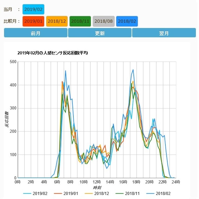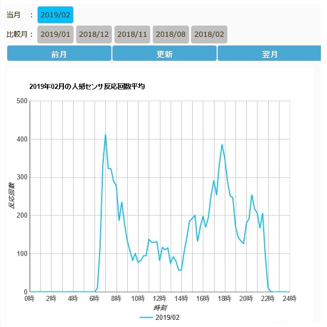 人感センサの反応回数は生活スタイルを反映しています。 部屋に閉じこもっていると反応回数は大きくなり、アクティブに活動している場合は、変動量が大きくなります。 一日の活動量は日々異なりますが、朝起きてから、寝るまでの生活スタイルは各個人で大きく変わらないため、1か月の時間毎の活動量の平均をとると、ほぼ同じ波形となります。 この一か月毎の活動量の平均を過去のデータと比較することで生活スタイルが変化していることを可視化することができます