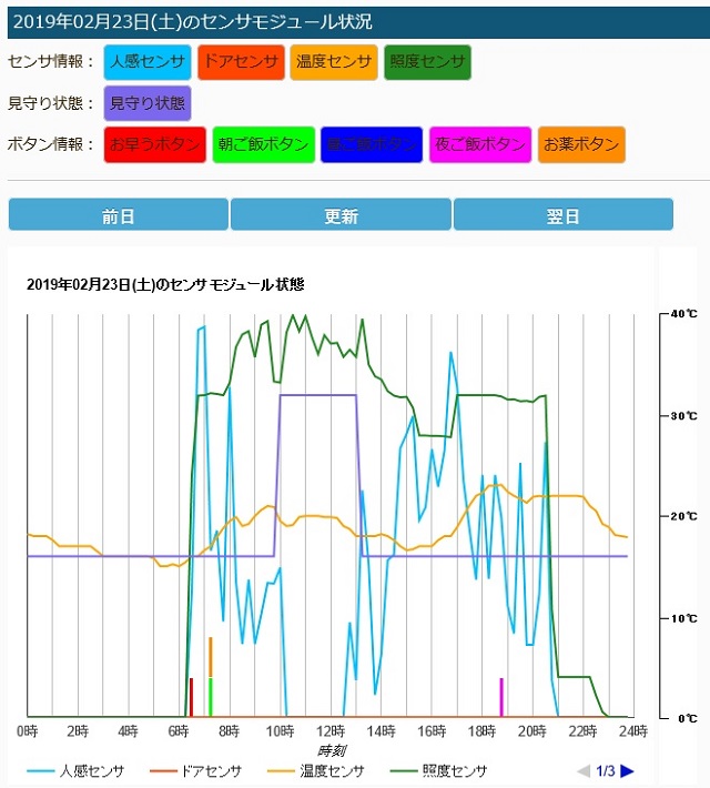 クラウドの日毎グラフを利用すると、離れて暮らす家族や介護者は、高齢者様の一日の状況を一目で把握することが可能です。