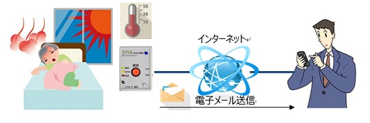 温度センサにより、居室内の気温をモニタします。 居室内の気温が設定値より高くなると見守り異常メールを送信します。